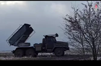 Боевая работа расчёта реактивной системы залпового огня БМ-21 «Град» по позициям ВСУ на западной окраине населенного пункта Часов Яр