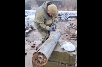 Выглядящая крайне безопасно распаковка украинским солдатом несработавшего 300-мм реактивного кассетного снаряда 9М55К от РСЗО «Смерч»