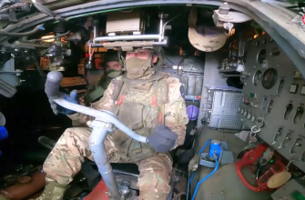 Украинский солдат демонстрирует повреждения своей «Бредли», полученные от огня российской 30-мм автопушки