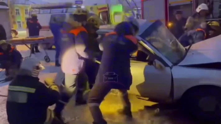 После удара машину развернуло — и она врезалась в гаражи. Водителя доставали спасатели. Информации о его состоянии нет.