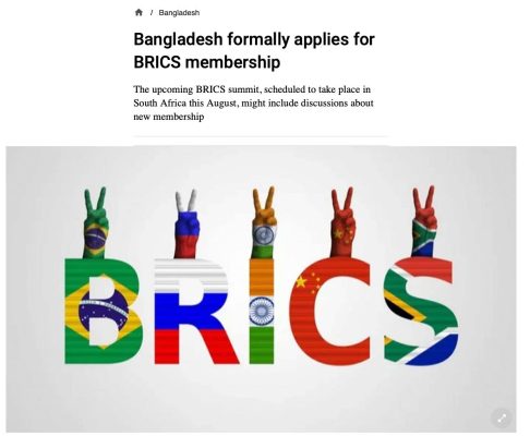 Как сообщает издание «Дакка Трибьюн», официальный запрос на вхождение Бангладеш в БРИКС подала премьер-министр страны Шейх Хасина. Письмо направлено в ЮАР.