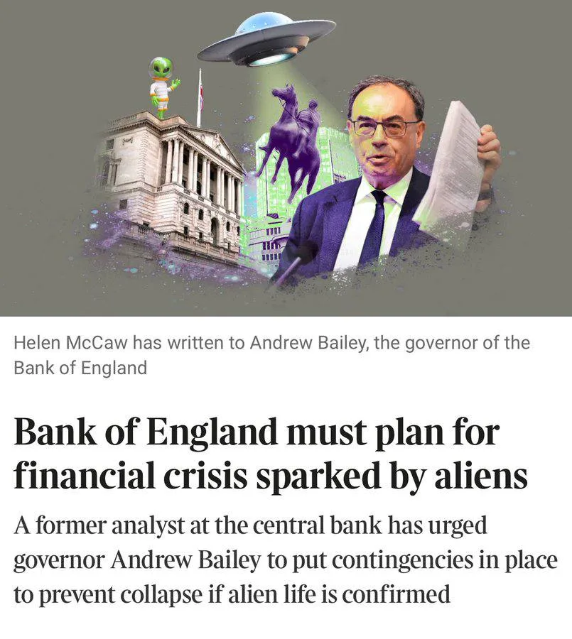 А вот бывший аналитик центробанка Англии Хелен Маккоу впечатлилась настолько, что написала письмо управляющему: если Белый дом вдруг официально подтвердит существование инопланетной жизни, это может напугать людей и вызвать хаос в экономике. Она призвала заранее подготовить план действий. Банк Англии промолчал.