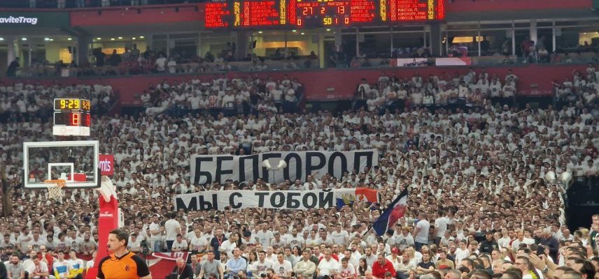 Болельщики во время баскетбольного матча «Црвена Звезда» — «Партизан» развернули плакат в поддержку жителей Белгорода.