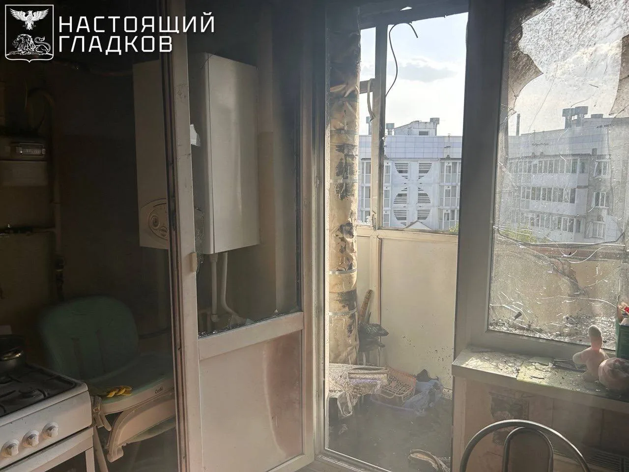 В Шебекино FPV-дрон ударил по многоквартирному дому, в результате чего в одной из квартир загорелся балкон (фото 1, 2 и 3). Пожарным расчётом возгорание оперативно ликвидировано. Кроме того, поступила информация, что в городе вследствие прилёта двух артснарядов этой ночью в двух частных домах выбиты окна, ещё в одном — посечены забор и ворота.