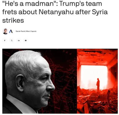 «Биби ведёт себя как сумасшедший. Он всё время бомбит всё подряд», — заявил один из чиновников. По его словам, действия Нетаньяху ставят под угрозу усилия США на Ближнем Востоке. Особенно резко восприняли удар по церкви в Газе — из-за него Дональд Трамп лично позвонил израильскому премьеру и потребовал объяснений.
