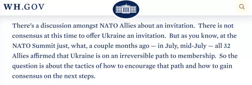 «Среди союзников по НАТО идет дискуссия о приглашении. На данный момент нет консенсуса относительно того, чтобы предложить Украине приглашение. Но, как вы знаете, на саммите НАТО в середине июля все 32 союзника подтвердили, что Украина находится на необратимом пути к членству. Поэтому вопрос в тактике того, как поощрять этот путь и как достичь консенсуса относительно следующих шагов», — заявил на брифинге представитель администрации Байдена.