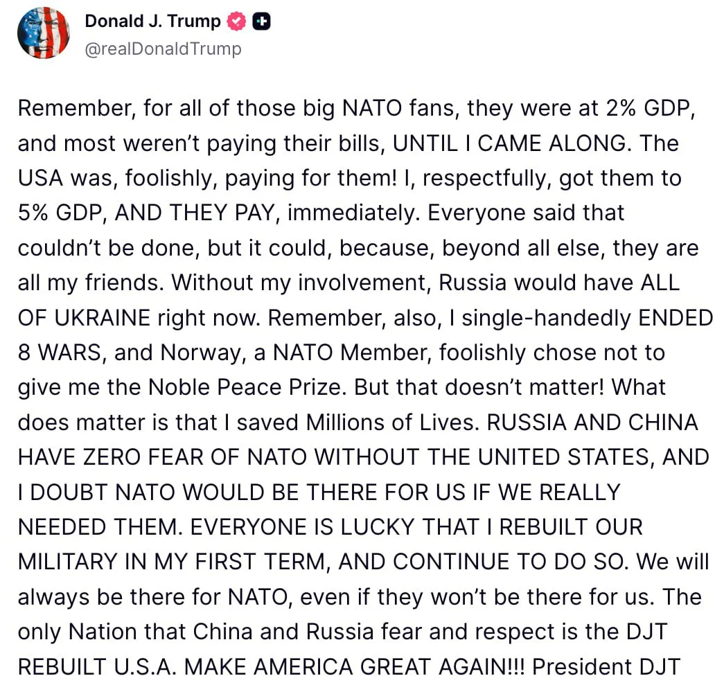 При этом американский президент выразил сомнения в эффективности НАТО без США и заявил о единоличном авторитете Штатов: «Россия и Китай не испытывают никакого страха перед НАТО без Соединённых Штатов… Единственная страна, которую Китай и Россия боятся и уважают, — это восстановленные мной Соединённые Штаты Америки».