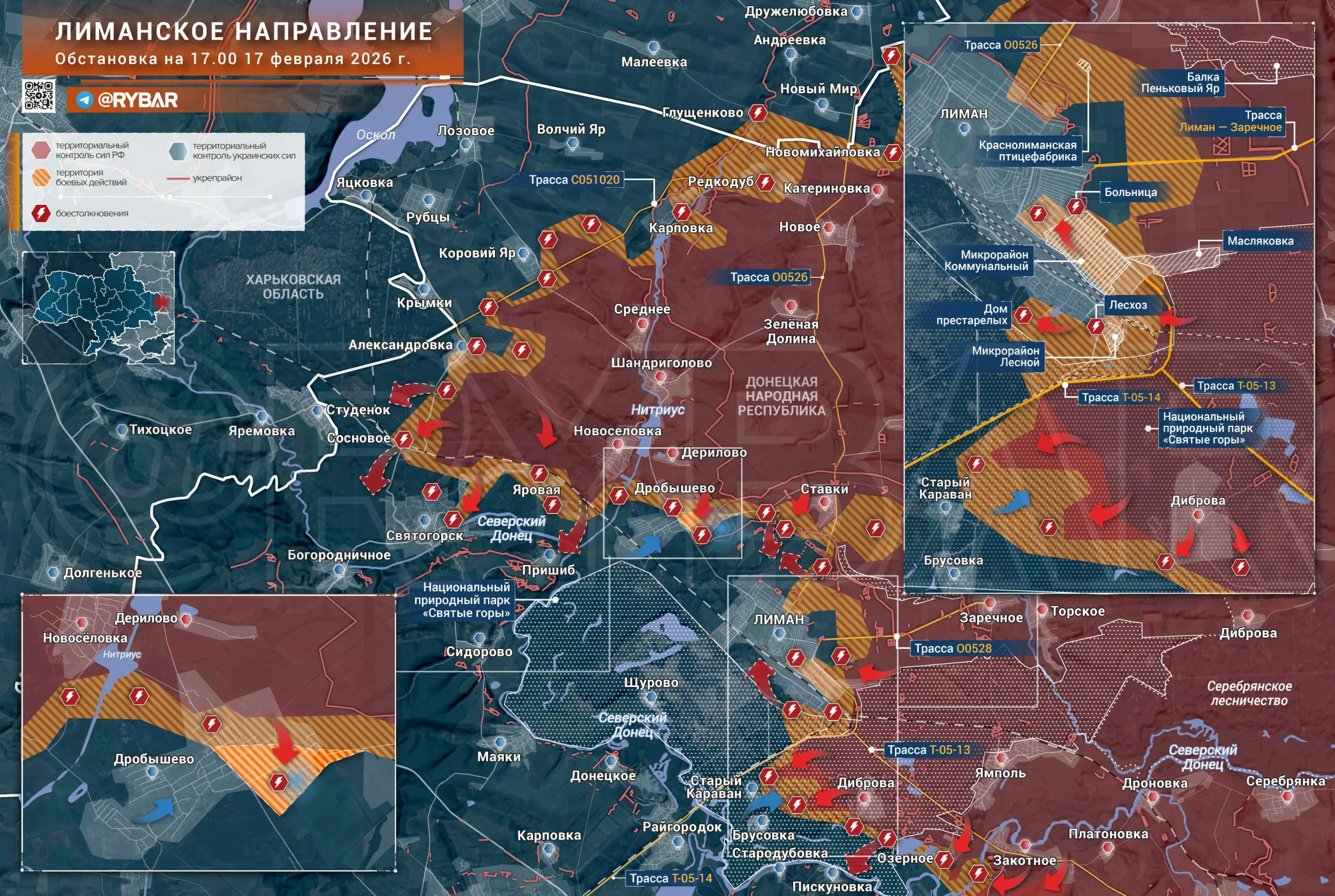 Судя по векторам атак ВС РФ, следующая задача — перерезать на земле ранее нарушенную беспилотниками логистику противника у Северского Донца. Трасса Т-05-14, ведущая к югу от Лимана, фактически выведена из устойчивого использования. Дорога через Дробышево находится под ударами БЛА, переправа в районе Яровой также серьёзно ограничена. В результате снабжение украинских формирований возможно либо за счёт накопленных запасов, либо по второстепенным просёлочным тропинкам со стороны Маяков и Щурова. При этом с наступлением весенней распутицы проходимость лесных участков снизится еще больше.