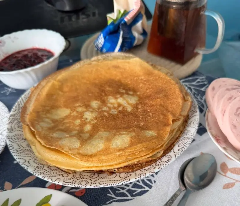 - Кипяток в тесте «заваривает» клейковину — блины не рвутся.
