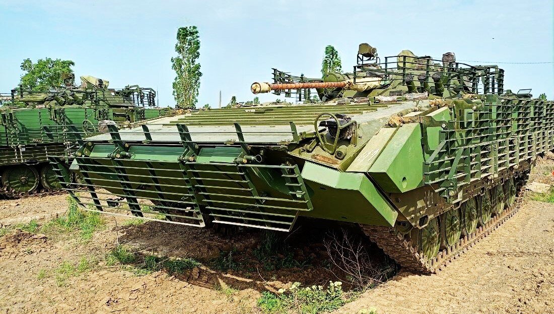 Однако, по ряду причин, аналогично ситуации с БТР, было принято решение оснастить БМП-2 комплектом дополнительной защиты ( 675 Сб3КДЗ), включающем в себя противокумулятивные решетки, дополнительные стальные броневые экраны, а также специальные стальные модули в лобовой и бортовой части корпуса, заполненные полимерным материалом и предназначенными для сохранения амфибийных качеств. Кроме того, в свое время, Курганцы проработали вопрос повышения боевой живучести БМП-2, в том числе за счет размещения топливных баков в изолированных отсеках по бортам корпуса в зоне десантного отделения, однако применяется ли эта, весьма полезная опция на строевых машинах ( хотя бы поступающих с завода)- неизвестно. По опыту боевых действий усилена также защита головных частей прицелов наводчика и командира, введены маскировочные покрытия типа «Накидка»и «Терновник», закрепленные на корпусе и башне. В войсках также на БМП-2 кустарно устанавливаются средства постановки помех и различные конструкции козырьков для защиты от FPV-дронов-камикадзе. Опять же нет данных по использованию на БМП дополнительных противоминных поддонов на днище корпуса ( хотя от подрыва на противотанковой мине такая конструкция все равно не спасет).
