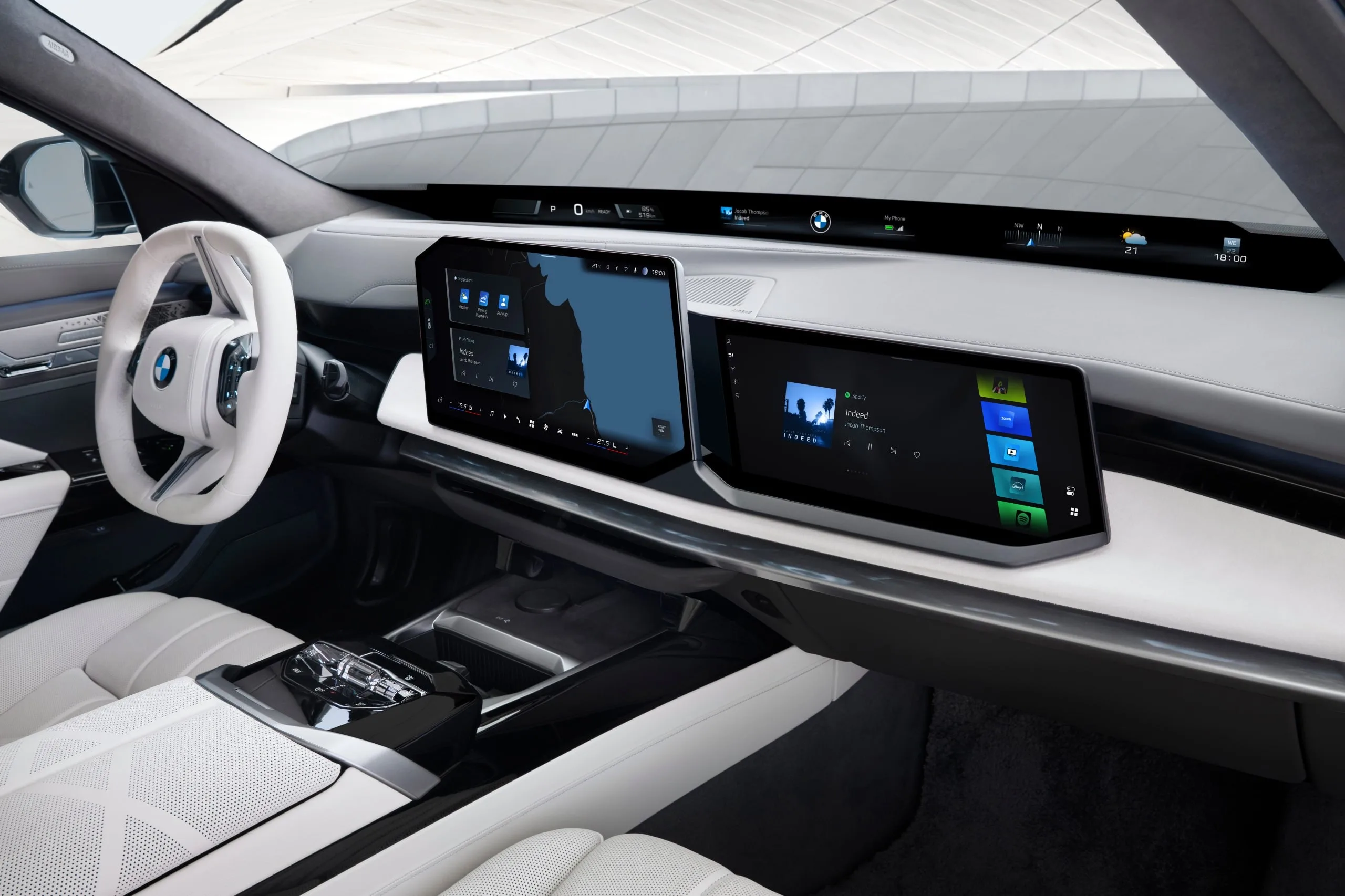 В салоне разместили проекцию Panoramic Vision, к которой добавили два экрана и необычный руль. Опционально можно добавить огромный 31-дюймовый 8K-монитор в потолке.