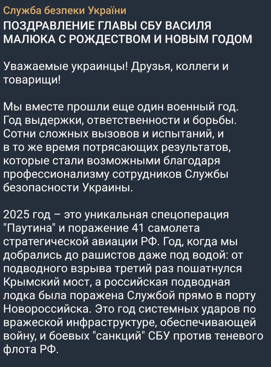 В своём обращении Малюк назвал 2025 год периодом «системных ударов по вражеской инфраструктуре» и особо выделил операции против так называемого теневого флота РФ. По его словам, это стало частью «боевых санкций СБУ» против России.