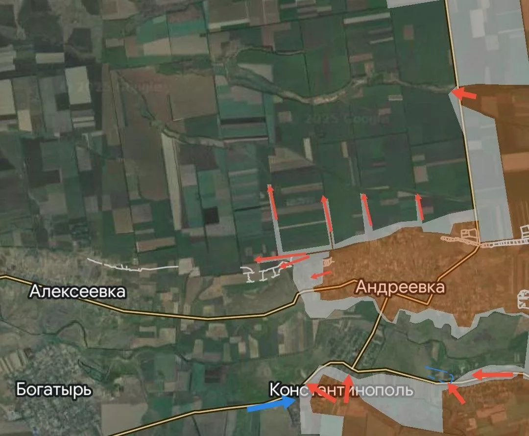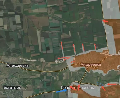 Севернее Андреевки наши подразделения развивают наступление в посадках в направлении Преображенки – Серебряного, выходя во фланг и тыл укропам в районе балки Ставковая, обходят с севера опорник противника северо-западнее Андреевки, продвигаясь в направлении Алексеевки.