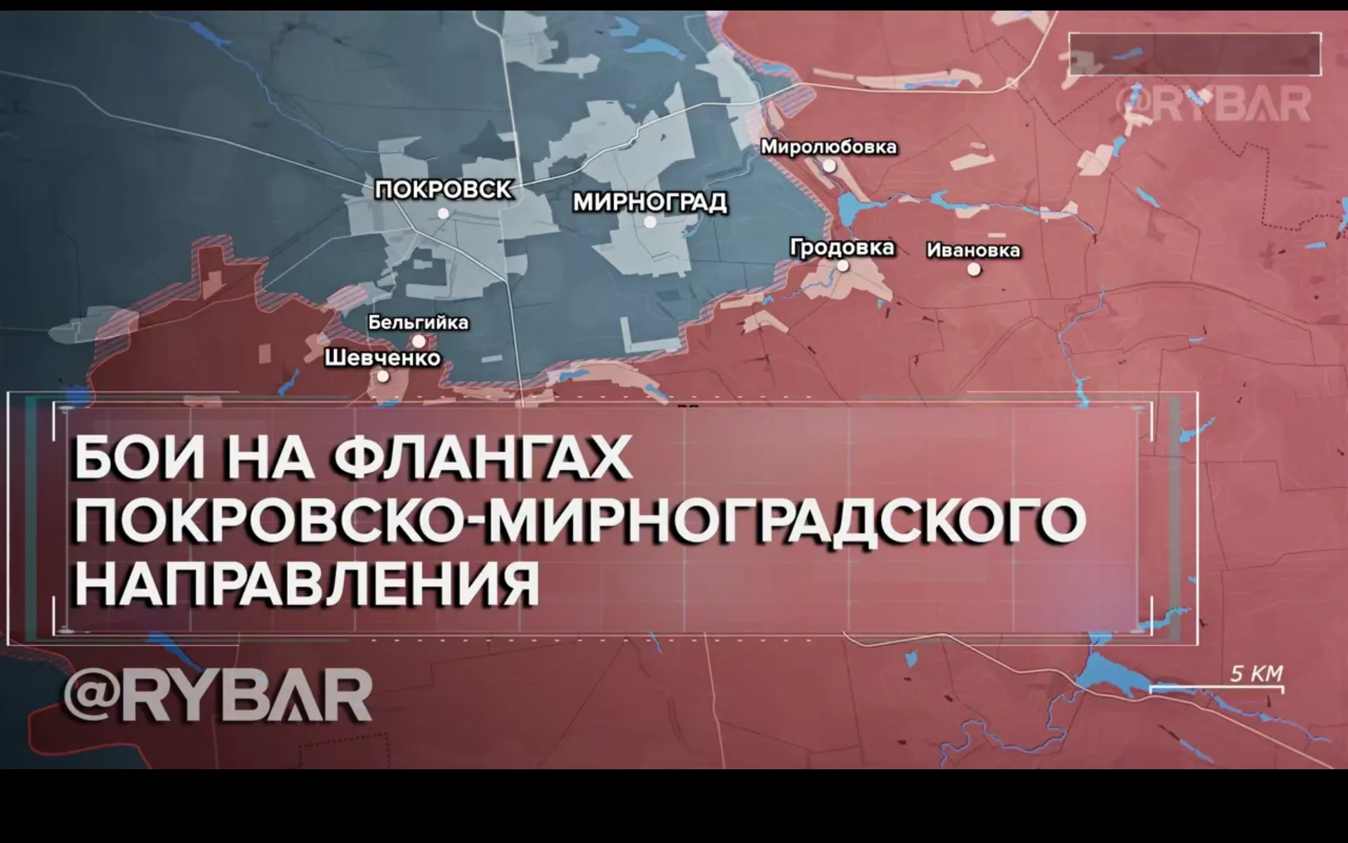 На Покровско-Мирноградском направлении продолжается охват группировки противника в агломерации. Российские войска ведут наступление одновременно с восточного и западного флангов, все сильнее сжимая кольцо окружения на рубеже Покровск — Родинское.