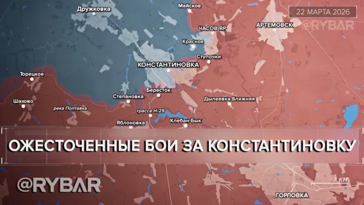 К концу марта российские войска закончили подтягивать резервы к фронту, продолжив просачиваться в Константиновку. Бои идут в южной части и на обеих флангах города, ВС РФ оказывают поддержку операторы БЛА, уничтожая логистику ВСУ.