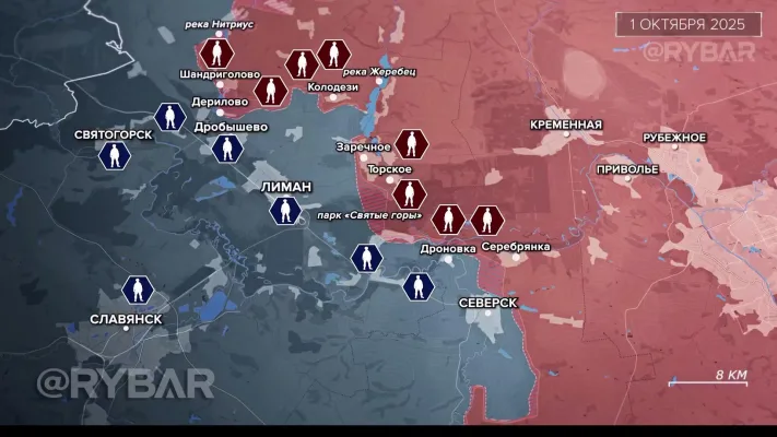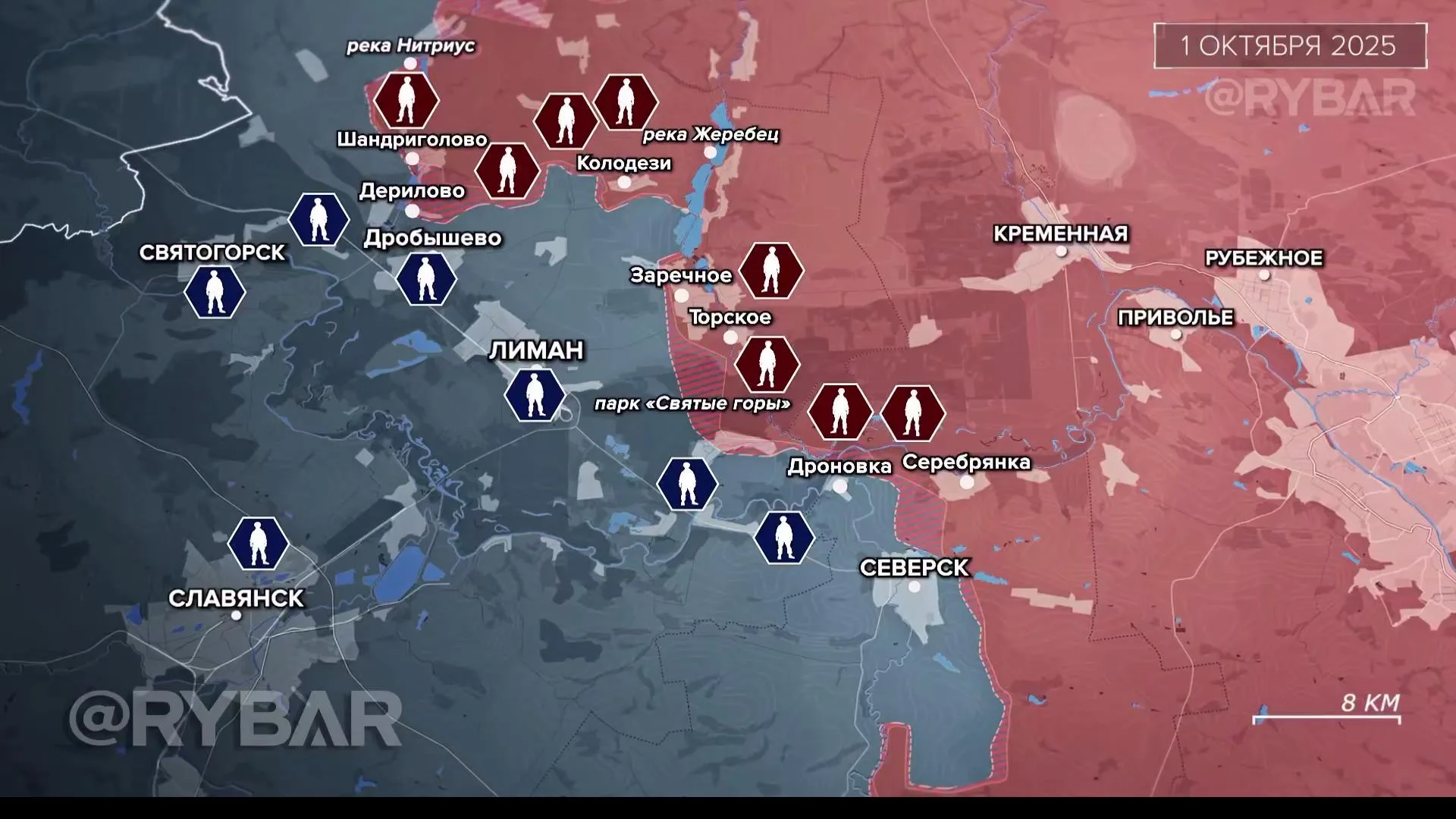 В октябре российские войска широким фронтом продвигались к Лиману. На восточных подступах к городу штурмовики пробивали себе дорогу через лесной массив парка «Святые горы». Севернее они оттеснили противника с позиций в Шандриголово и Дерилово.