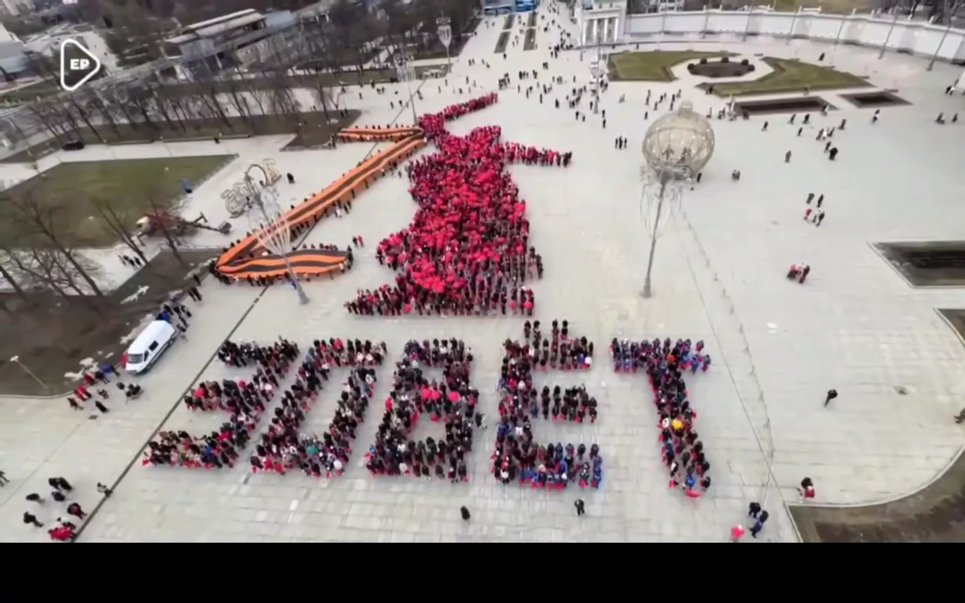 Представители «Молодой гвардии Единой России» и «Волонтёрской роты» выстроились в силуэт памятника «Родина-мать», а также развернули 300-метровую георгиевскую ленту.