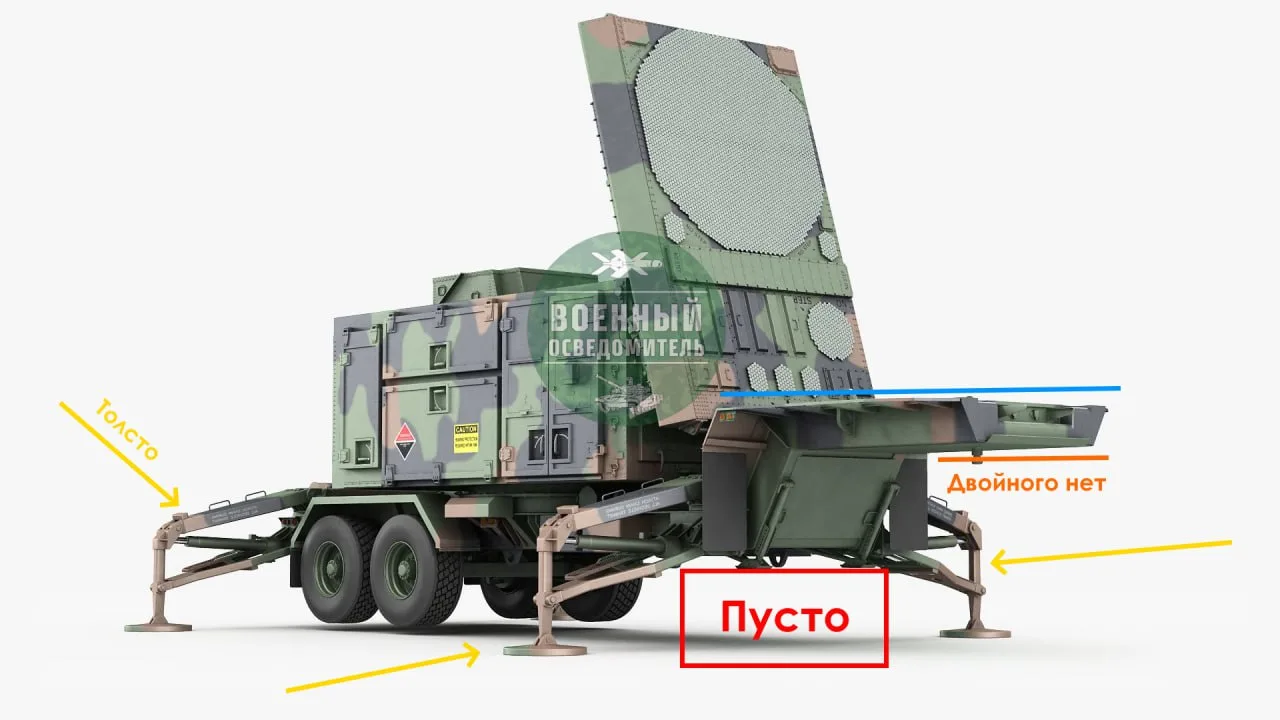 - Значительно отличается и фаркоп — на изделии с видео он вовсе двойной, тогда как на настоящем радаре он имеет другую форму. Скорее всего, как и со стойками, его нижняя часть является настоящим узлом сцепки, тогда как верхняя имитирует таковую у РЛС Patriot. Схожие проблемы наблюдаются и у «пусковой установки»: