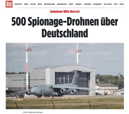По данным Bild со ссылкой на секретный отчёт Федерального уголовного ведомства Германии, с января по март над военными объектами и критической инфраструктурой страны зафиксировано 536 дронов.