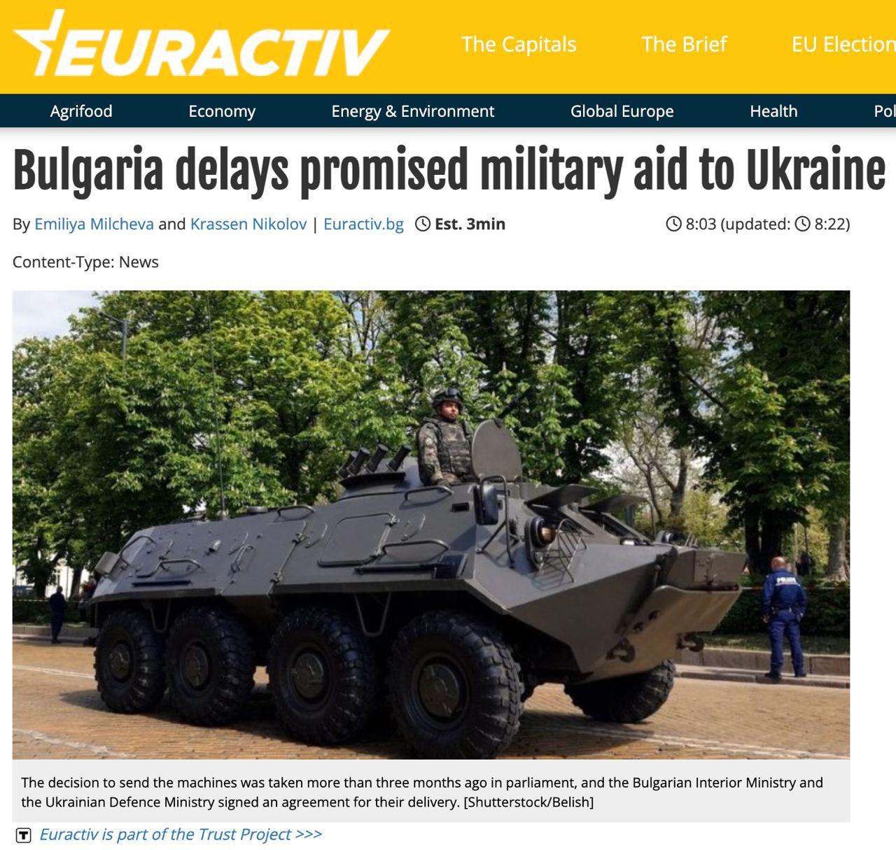 ✖️ Соглашение о поставке Болгария и Украина подписали еще три месяца назад, но из-за логистических вопросов партия БТР так и не была отправлена. София за транспортировку, похоже, принципиально платить не собирается. Президент Болгарии ранее наложил вето (https://t.me/OstashkoNews/108696) на эту сделку, но парламент его преодолел.