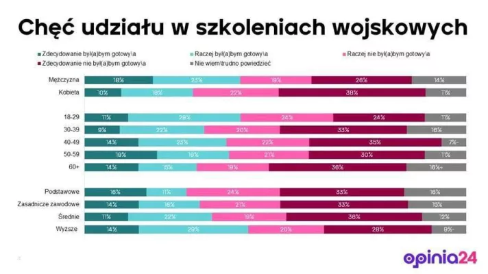 О желании принять участие в военной подготовке заявили 35% респондентов. Наибольшее количество желающих зарегистрировано среди людей в возрасте 18-29 лет (40%), наименьшее — среди тех, кто старше 60 лет (29%).