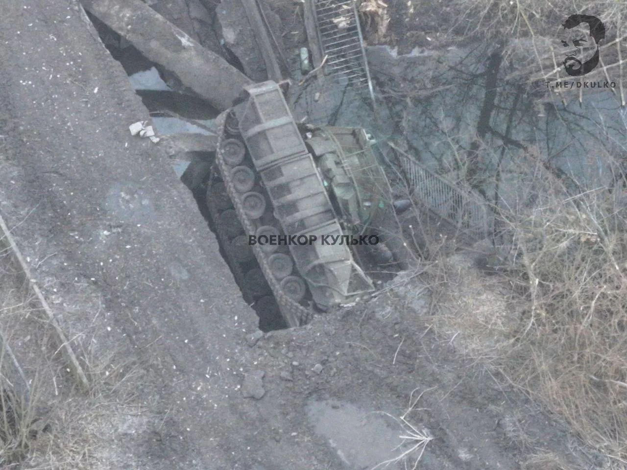 В украинском селе Журавка возле границы уссурийские десантники ФПВ-дронами подбили опоры моста через реку Снагость. Конструкция обрушилась, когда укропы пытались проехать по ней на “Бредли”. Натовская БМП завалилась на бок и получила контрольную фпивишку в днище. Ещё несколько ударов дронами окончательно обрушили мост.