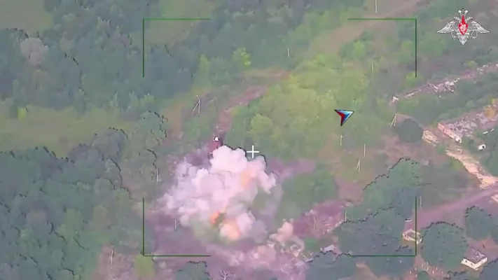 На этих кадрах удар ОТРК «Искандер» уничтожил несколько большегрузных автомобилей с техникой и вооружением ВСУ, а также до 20 украинских военнослужащих в районе н.п. Стахорщина Черниговской области.