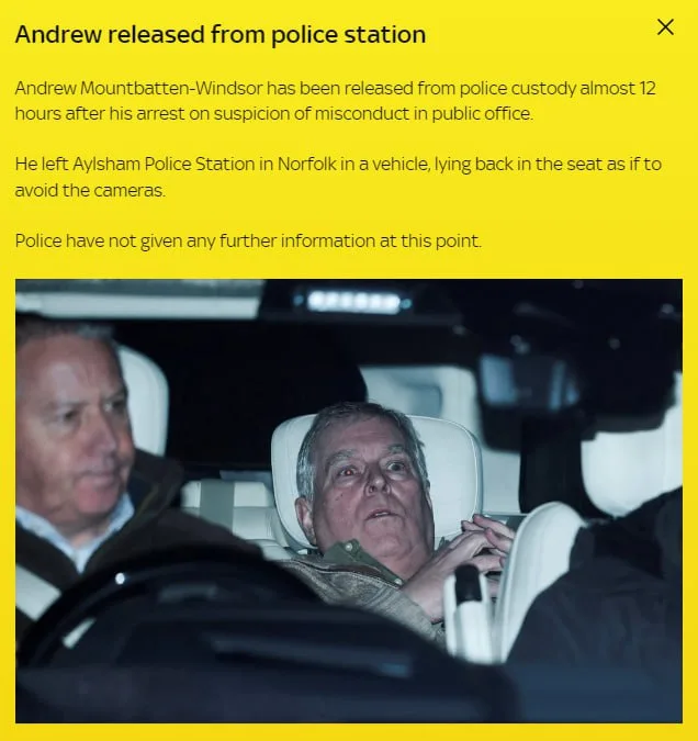 Как пишет Sky News, член королевской семьи покинул полицию, откинувшись на спинку сиденья автомобиля — словно пытался скрыться от камер.