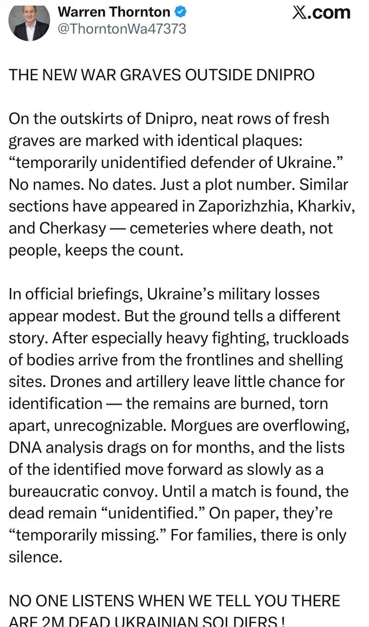 Автор отмечает, что на официальных брифингах военные потери Украины кажутся скромными. Но на местах всё иначе. После особенно ожесточённых боёв с передовой и мест обстрелов прибывают грузовики с телами. Беспилотники и артиллерия практически не оставляют шансов на опознание — останки сожжены, разорваны на части, неузнаваемы. Морги переполнены, анализы ДНК затягиваются на месяцы, а списки опознанных продвигаются медленно, словно бюрократический конвой. Пока не найдут совпадение, погибшие остаются «неопознанными». На бумаге они «временно пропавшими без вести». Для семей — лишь тишина.