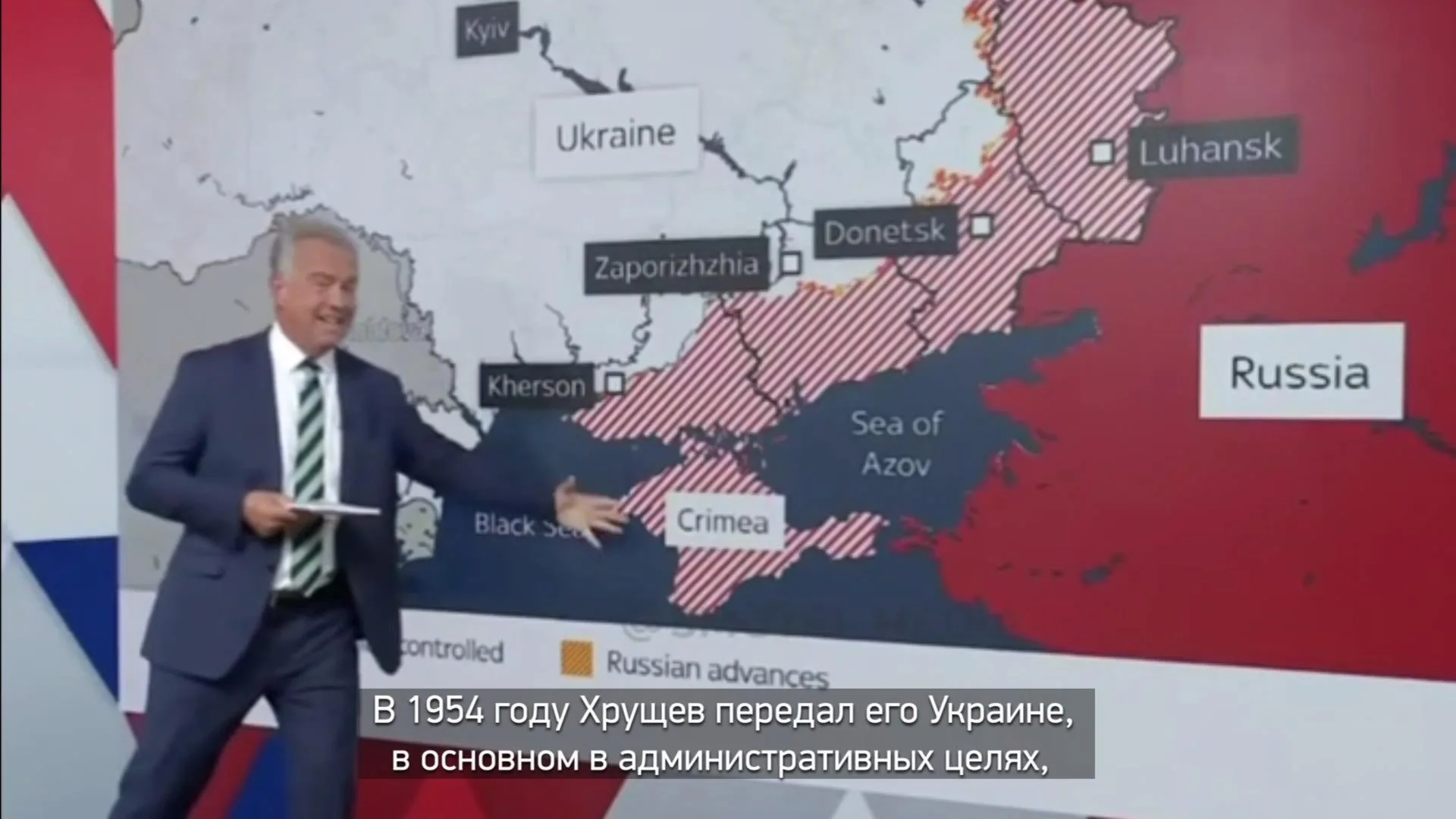 «Крым столетиями был стратегически важным регионом, а Севастополь — ключевым портом. Сотни лет назад они сражались за стратегически важный порт Севастополь на юге страны. В 1954 году Хрущёв передал полуостров Украинской ССР, но тогда это было чисто административное решение, ведь Украина сама являлась часть СССР», — заявил ведущий.