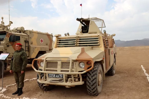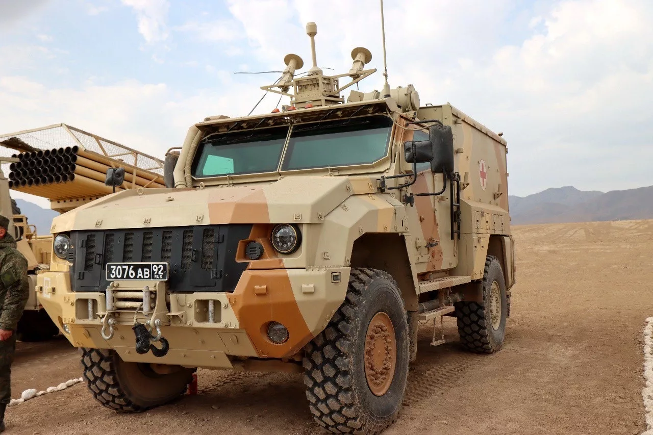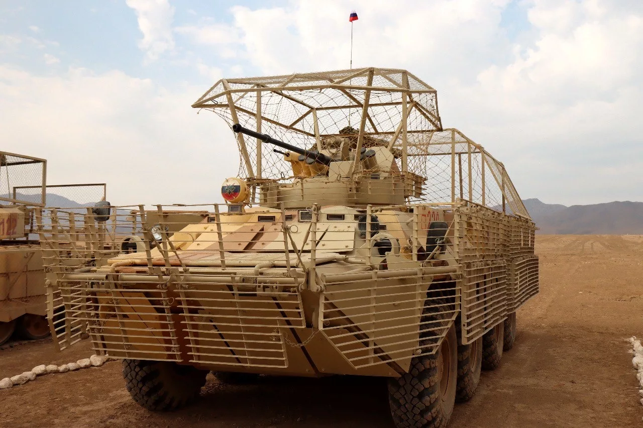 Бронеавтомобиль АСН 233115 «Тигр-М СпН» с станковым крупнокалиберным пулемётом ДШК в антидроновом скворечнике и дополнительным бронированием, БТР-82А со штатным комплектом защитных экранов заводского производства, а также антидроновыми защитными козырьками, включая защиту моторного отсека.