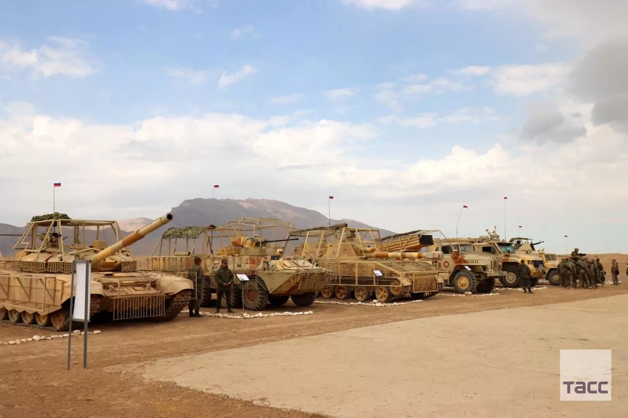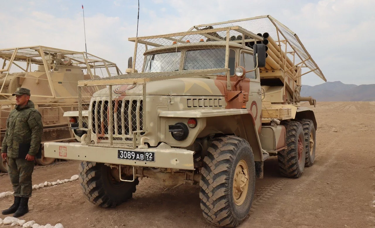 САУ «Акация», Т-72Б3М, РСЗО «Град-М» с антидроновыми козырьками, а также КамАЗ-53949 «Линза» с передатчиком помех РП-377УВМ2 на учениях ОДКБ «Рубеж-2024».
