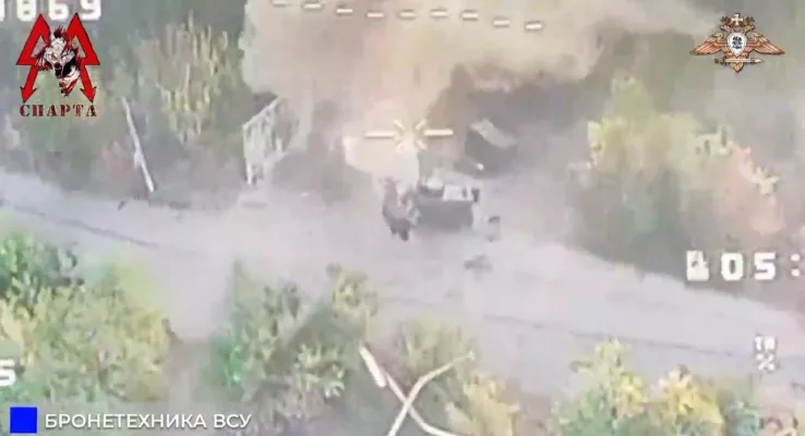 Операторы БЛА «Спарты» вновь наносят сокрушительный удар по технике и личному составу украинских оккупационных войск. С точностью и решительностью, характерной для профессионалов, они успешно уничтожили бронированную боевую машину боевиков вместе с экипажем.