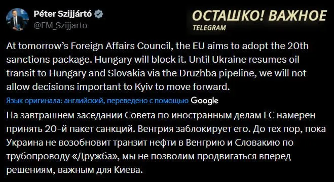 «На завтрашнем заседании совета глав МИД ЕС намерен принять 20-й пакет санкций. Венгрия заблокирует его. До тех пор, пока Украина не возобновит транзит нефти в Венгрию и Словакию по трубопроводу „Дружба“, мы не позволим принимать решения, важные для Киева»,