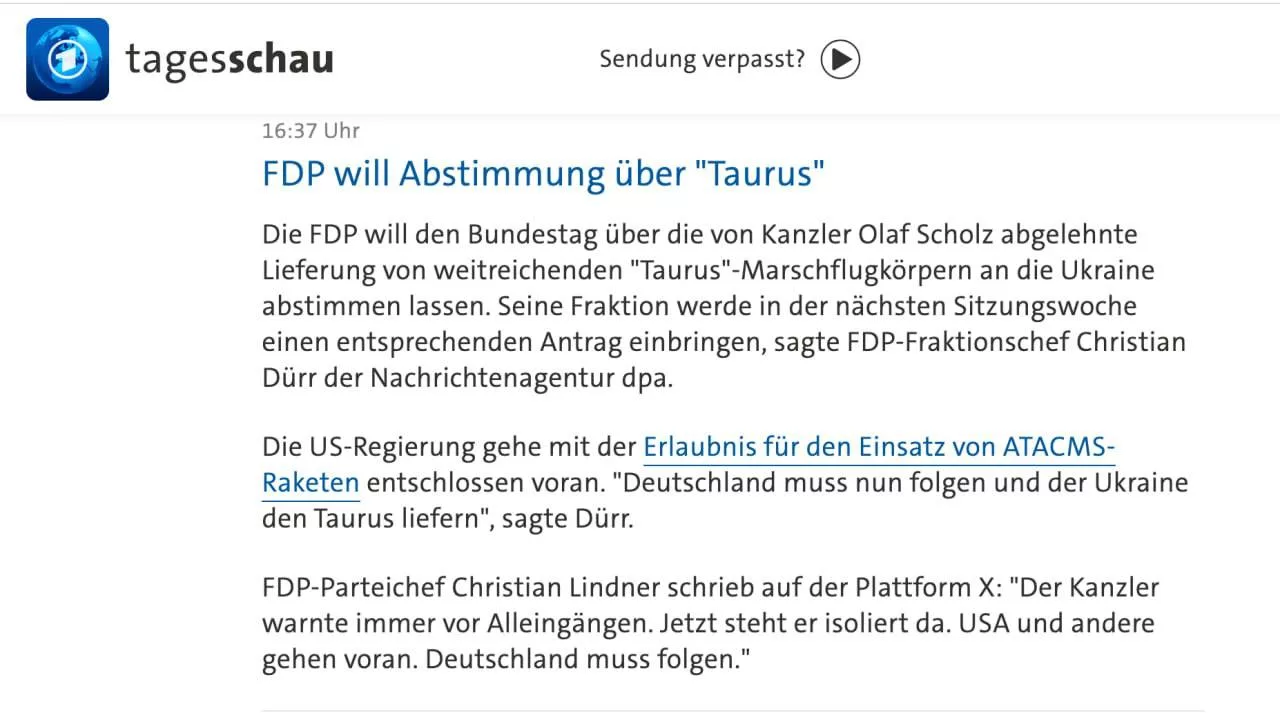 Издание сообщает, что парламент Германии в который раз рассмотрит предложение о начале поставки дальнобойных ракет Taurus Украине. Соответствующую инициативу вынесет к голосованию Свободная демократическая партия.