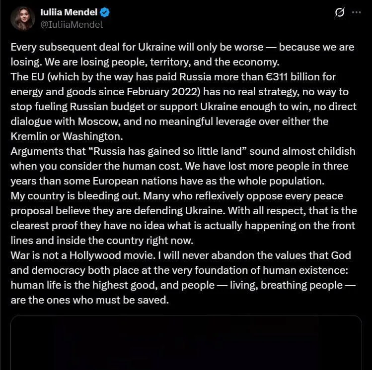 По её словам, каждое новое предложение для Украины будет ещё хуже, так как ситуация для страны на поле боя ухудшается, а у Евросоюза нет никакой реальной стратегии.