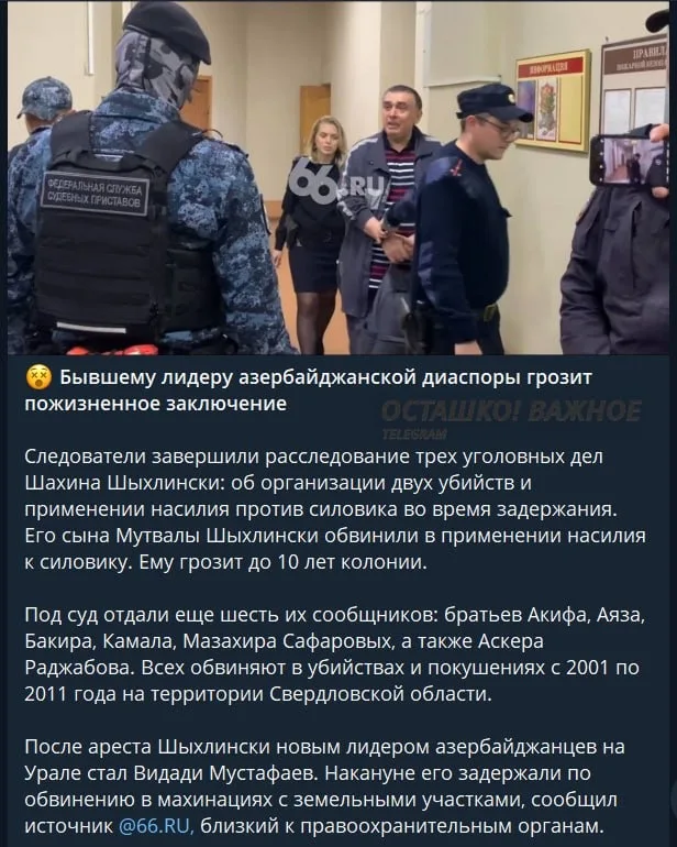 ▪️В начале июля спецназ задержал Шыхлински у ТЦ «Баку Плаза» в Екатеринбурге, когда он парковал автомобиль вместе с сыном Мутвали. Второй, сидя за рулём, сбил дверью спецназовца, причинив тяжкий вред его здоровью. Мутвали ужесточили обвинение за применение насилия, опасного для жизни или здоровья представителя власти (до 10 лет колонии).