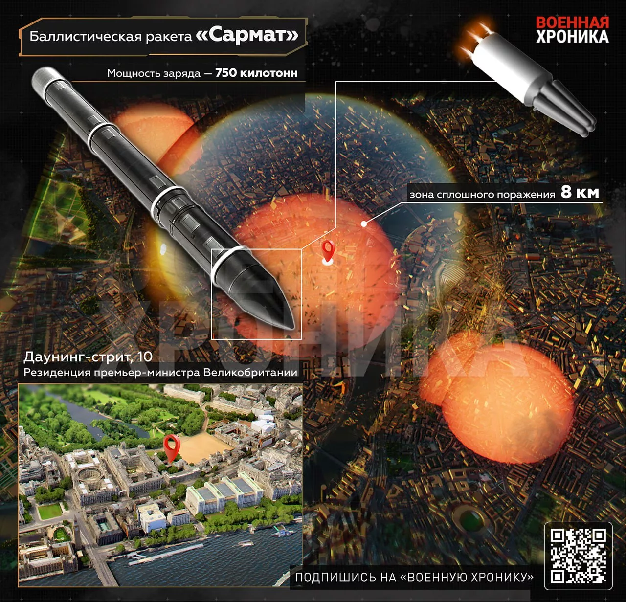 Ракета «Сармат», с максимальной дальностью полёта около 18 тысяч километров, способна доставить к цели боеголовки общей массой до 10 тонн. Мощность каждой боеголовки — 750 килотонн — достаточна для гарантированного уничтожения не только военных объектов, таких как базы Каттерик, Брайз Нортон, Лейкенхит или Клайд (где базируются подлодки Vanguard), но и ключевых центров принятия решений. Например, резиденция премьер-министра Великобритании на Даунинг-стрит, 10 в Лондоне, станет одной из первых целей для ответно-встречного ядерного удара. Если Британия решит применить ядерное оружие против России, то вместе с резиденцией премьера Кира Стармера с лица Земли будет стёрта примерно треть Лондона. А если «Сармат» с полным блоком вооружения не пожалеют на всю британскую столицу, то этот город перестанет существовать целиком.