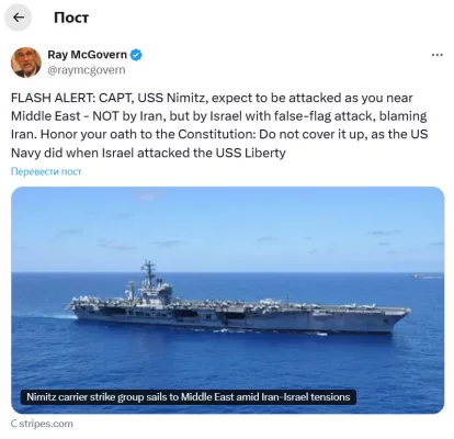 Главная страница » Новости и статьи Бывший ЦРУшник Рэй МакГоверн считает, что США могут намеренно затопить старейший атомный авианосец USS Nimitz у берегов Ирана и обвинить в этом Иран. Так образом операция под ложным флагом позволит официально атаковать Иран Автор из команды сайта Опубликовано 18.06.2025Комментариев 0 Добавь сайт в закладки нажми CTRL+D What’s your Reaction? +1 0 +1 0 +1 4 +1 2 +1 7 +1 4 +1 0 What’s your Reaction? +1 0 +1 0 +1 4 +1 2 +1 7 +1 4 +1 0 Поделись видео: