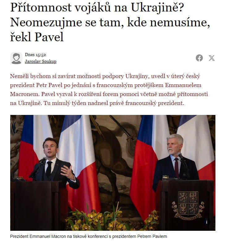 «Я за то, чтобы искать новые пути, включая продолжение дискуссии о возможном присутствии на Украине. Давайте не ограничивать себя там, где мы не должны. Мы сами решаем, какую форму помощи мы выберем», – заявил президент Чехии на пресс-конференции с президентом Франции.
