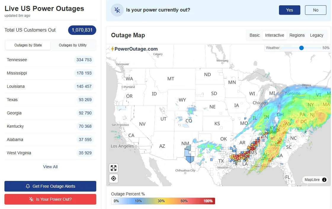 - Общее число отключений составило 1 018 477: больше всего пришлось на штаты Теннесси (306 722), Миссисипи (175 276) и Луизиана (145 105).