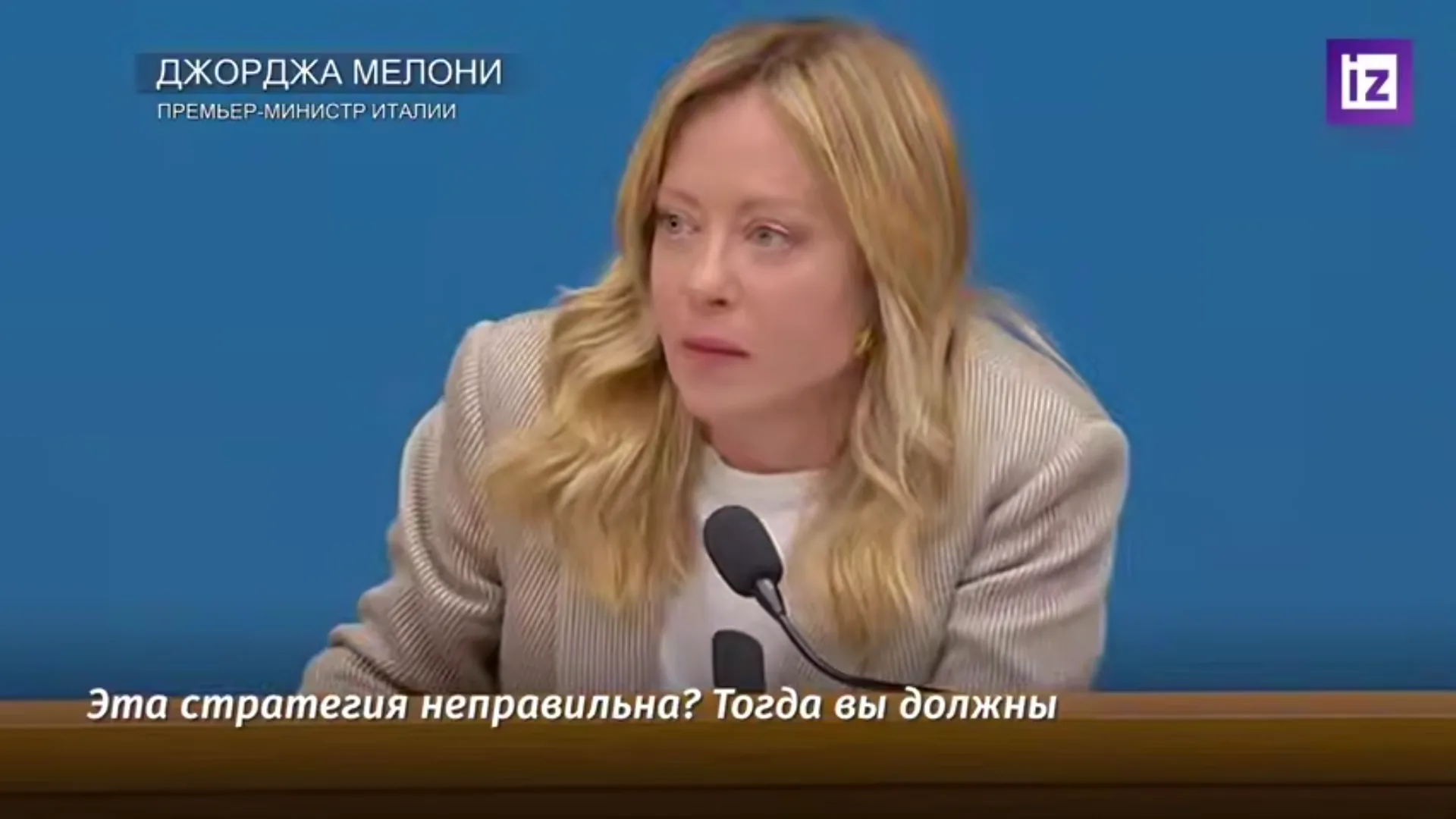 «Эта стратегия неправильна? Тогда вы должны формализовать для меня альтернативу, вы должны сказать мне, что вы намерены делать, то есть мы должны дистанцироваться, в том смысле, что мы должны: выйти из НАТО… мы должны закрыть американские базы… мы должны разорвать торговые связи… мы должны атаковать McDonald’s?», – не понимает Мелони.