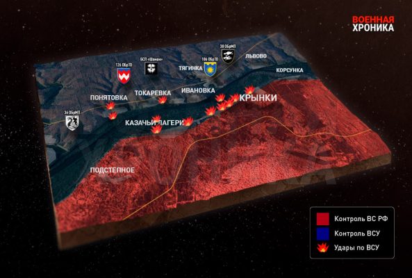 На протяжении нескольких недель между ВС РФ и подразделениями ВСУ на левом берегу Днепра в Херсонской области идут ожесточённые (https://t.me/fotovvideo/708) бои. ВСУ пытаются сохранить и расширить плацдарм в районе сёл Крынки и Казачьи Лагери в Алёшкинском районе. К уничтожению противника привлекаются значительные силы, однако ситуация пока развивается точно так же, как в случае с десантом ВСУ под Антоновским мостом, который Военная хроника подробно разбираларанее. Что в действительности происходит в районе сёл Крынки и Казачьи Лагери?