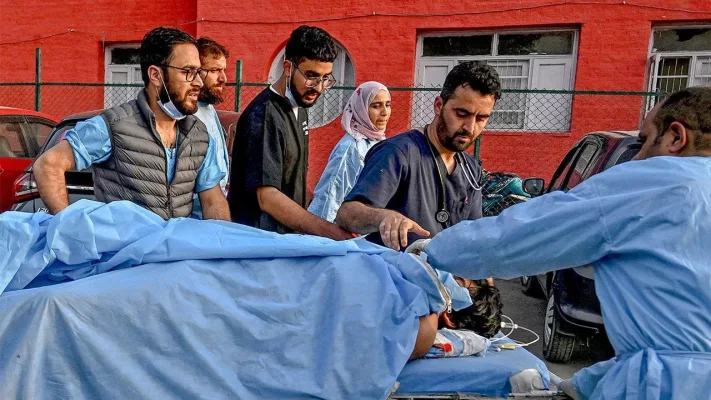 На фото — медики спасают раненого после нападения террористов в Кашмире.
