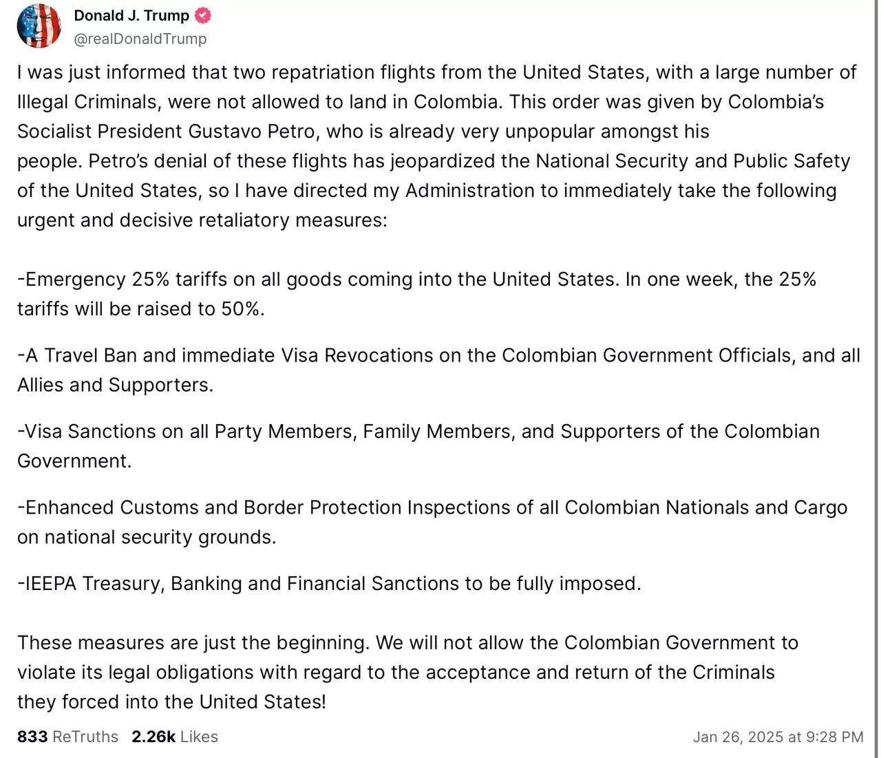 «Эти меры — только начало. Мы не позволим правительству Колумбии нарушить свои юридические обязательства в отношении приема и возвращения преступников, которых они насильно завезли в Соединенные Штаты!», — написал Трамп.