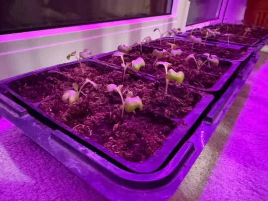 Правило: чем меньше света, тем ниже должна быть температура. Если этого не сделать, рассада начнёт вытягиваться, пытаясь добраться до света.