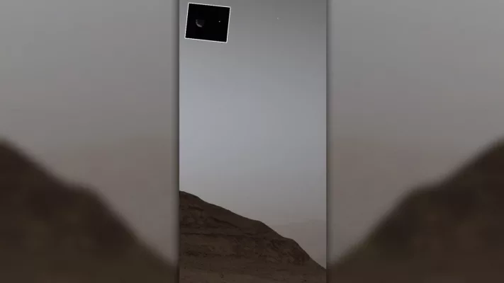 Необычные снимки сделал ровер Curiosity, который работает в кратере Гейла на Марсе. Команда миссии поймала момент, чтобы сфотографировать с помощью камеры Mastcam Землю в ночном небе Красной планеты как раз во время восхода одного из спутников Марса – Фобоса.