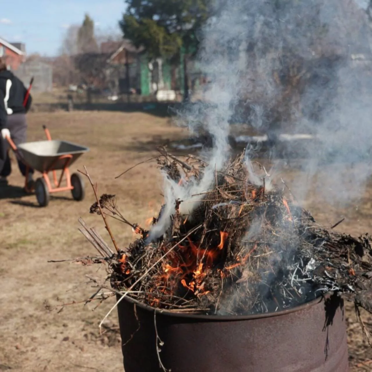 Чтобы провернуть все правильно, нужно создать специальное место для огня на безопасном расстоянии от построек и леса — котлован или металлический контейнер. Жечь можно только натуральный мусор: траву, листья, ветки. Также нужны средства для тушения на случай пожара.