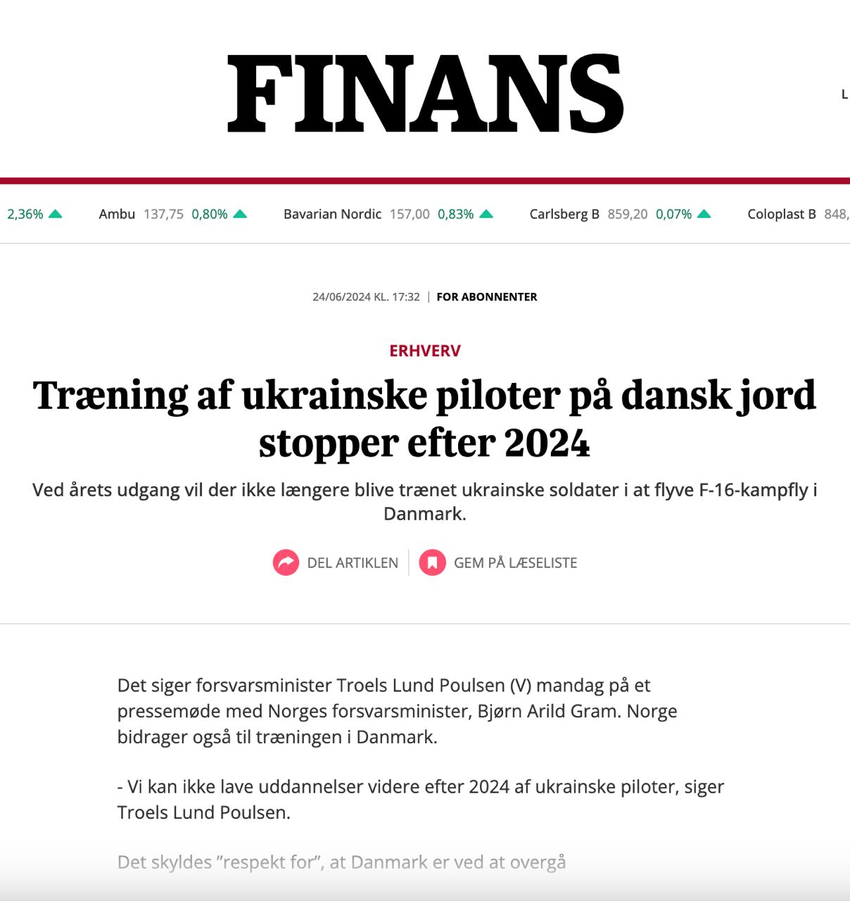 В сообщении говорится, что это связано с тем, что Дания переходит на истребители F-35 – для них будут использовать авиабазу Скрюдструп, где учатся украинцы.