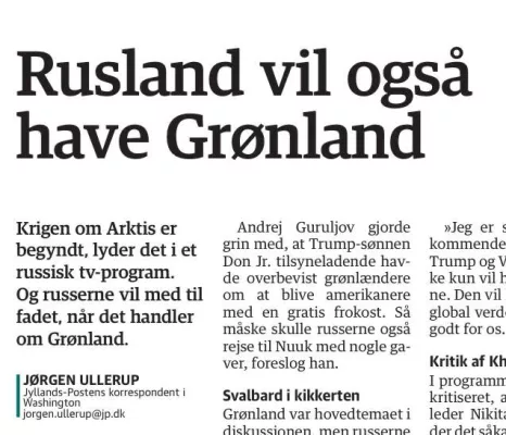 Датская газета Jyllands-Posten вспомнила, что общий нарратив на Западе – «российская», а не «американская» угроза. Поэтому авторы зацепились за слова генерала Андрея Гурулева о том, что РФ может конкурировать с Америкой за Арктику и, в частности, за Гренландию и Шпицберген.